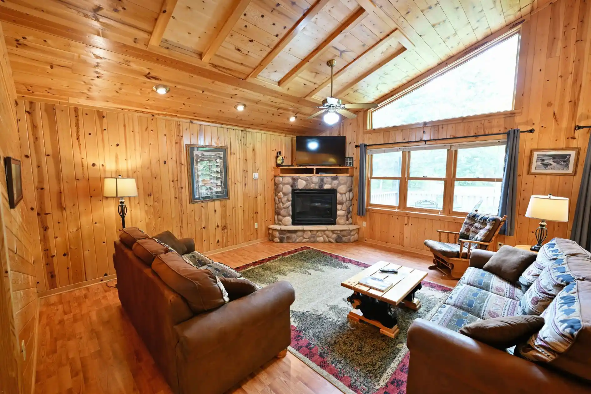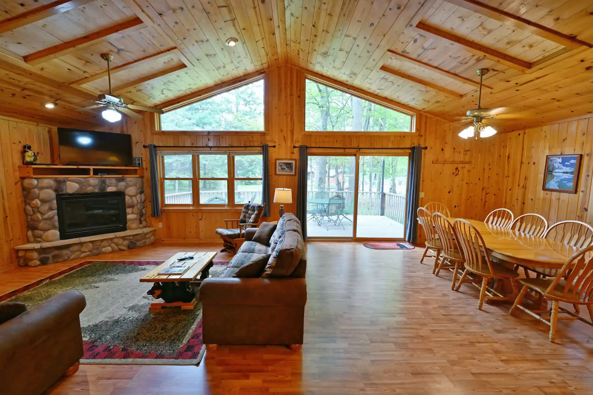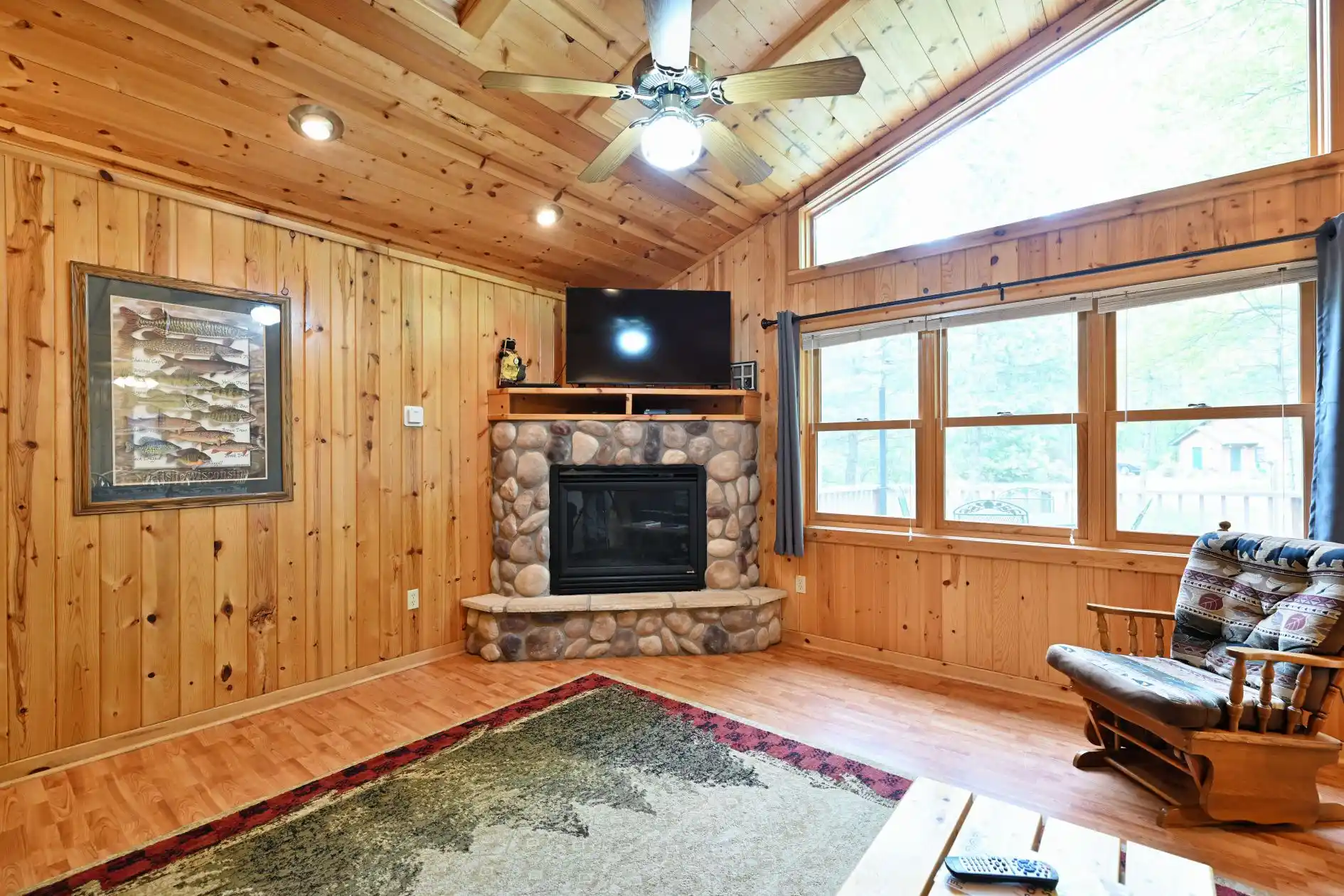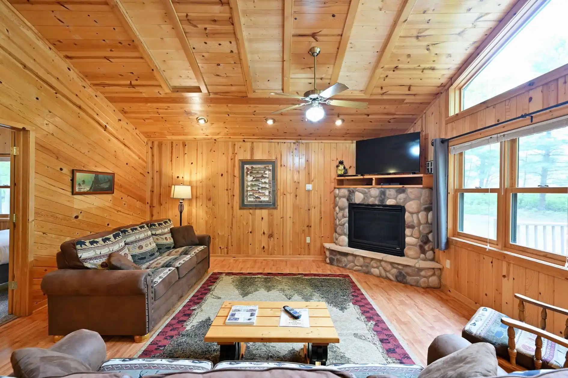This ultra-deluxe 3 bedroom, 3 bathroom vacation home is nestled amongst the virgin trees, just off of the shores of the legendary Chippewa Flowage. Sit out on your spacious deck with furniture for 8 at night, and listen to the music of the crickets and the bullfrogs, while Northern Lights dance across the sky. In the mood for a s'more, or just some old fisherman's tall tales – head on down to one of the firepits! The well equipped kitchen and dining area include air conditioning, all electric heat, deck with patio furniture and hood grill, fully equipped kitchens with solid top electric range, dishwasher, refrigerator/ freezer, microwave, coffeemaker, toaster, all cookware, dishes, utensils and all linens EXCEPT for personal bath towels. Keep up to date on current events with one of the 100+ channels on Dish Network on your HD flatscreen TV.
